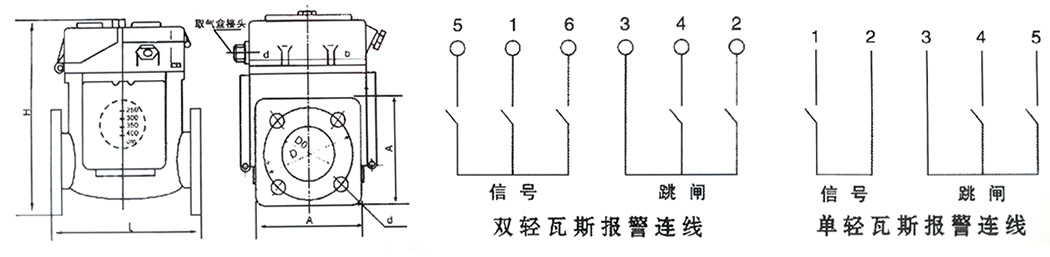 注:帶有接頭的氣體繼電器(俗稱G型產(chǎn)品)與取氣盒配套使用,定貨時(shí)提出要求,否則均不帶接頭。